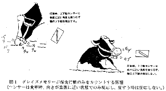 牛は反甥するときは頭を水平にし、草を採食するときは頭を下げるので、顎の角度が異なる。上下動センサーの角度を調節することで、採食しているときだけ口の上下動を感知する(図1)。