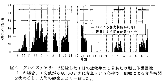 放牧牛の採食時間、採食時間帯、採食量を知ることは放牧草地の評価や放牧牛の栄養管理のために重要な情報であるが、これまでは人海戦術による行動調査か、高価でしかも不安定な装置を用いてしか計測できなかった。