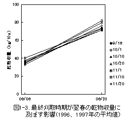 4)チモシーの放牧草地で9/15〜11/20に刈り取り高15㎝で模擬放牧を行った場合、翌春の再生に差は認められず、オーチャードグラスのような危険帯は確認できなかった(図1-3)。