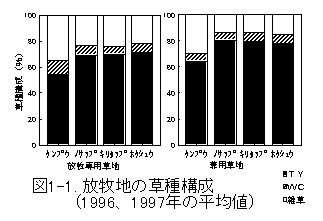 1)永続性の試験は入牧前の草丈が約30〜40cm、退牧後の草丈が約10〜20cmで行っており、さらに厳しい 放牧条件では草種構成が悪化する可能性がある。