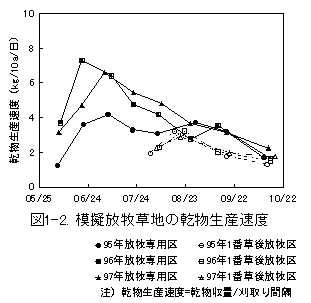 2)放牧専用区の乾物生産速度は6月下旬から7月にかけて最も大きく、8月以降は小さくなる傾向がみられた。1番草後放牧区では放牧専用区に比べて年次変動、季節変動が小さかった(図1-2)。