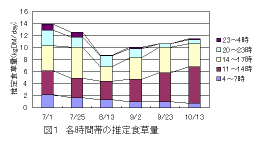 (10)夏期は夜間に放牧草を乾物5〜6㎏/日摂取したと推定され、夜間放牧の意義は大きいと考えられたが、秋以降は食草が昼間に集中し、夜間の食草はほとんどみられなかった(図1)。