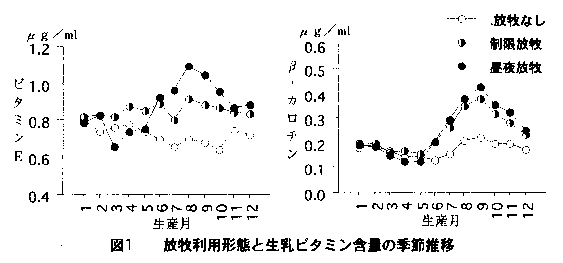 (3)生乳のビタミンEおよびβ−カロチン含量は放牧草の利用により増加した。7〜9月期の放牧なし群、制限放牧群および昼夜放牧群の生乳のビタミンE含量はそれぞれ0.68、0.87および1.04μg/mlで、β−カロチン含量は0.20、0.33および0.37μg/mlであった。これらの含量は、8月あるいは9月期に最大となった。この放牧利用農家群で高い含有量を示す傾向は放牧終了後も1ヶ月間持続した(図1)。生乳中のビタミンAの含量には放牧草利用の影響はみられなかった。