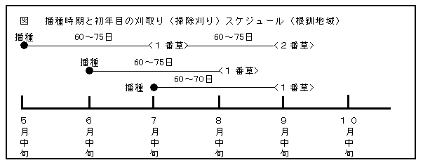 2)造成年1番草において雑草の発生が著しくてALやTYの生育が抑制されている場合、掃除刈 りは、草地の状態を観察しながら播種後60日目以降より実施する。