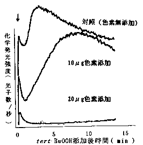 2)本色素の活性酸素消去能は化学発光法(図2)で検出され、また同量のβカロチンよりもリノ−ル酸メチルの過酸化物生成を抑制する能力が高く、活性酸素消去能に優れる。