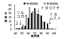 供試材料:わい化病抵抗性の異なる両親間の分離集団2組合せ、「中交0505(「ツルコガネ(強)」×「トヨムスメ(弱)」)」および「中交0506(「ツルコガネ(強)」×「トヨコマチ(弱)」)」。