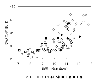 図2.粉蛋白含有率とパン体積との関係(中央農試)