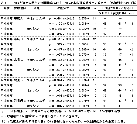 1)各年次(平成8、9年)、試験地、品種別にみると、小麦の粘度上昇期(およそ出穂期より30日目以降)のFNと出穂期からの積算気温との間に有意な正の相関関係が認められた(表1、r=0.871**〜0.999**, n=3〜16)。このことから、FNを目的変数(Y)、積算気温を説明変数(X)とした一次回帰式を各々求め、FNが300s(アミログラム最高粘度で380BU相当)を超える時期の推定を行ったところ、実測値と高い適合度が得られた(表1)。また、この回帰式の傾きにより、子実水分乾減に基づく収穫開始時期までにFNが300sに到達するか否かが判定され、傾きが0.8以上では到達し、同じく0.5以下の場合は到達できないと判断された。