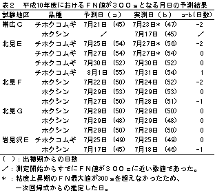 3)以上のマニュアルを基に、現地における適合度を平成10年に調査したところ、予測日と実測日の差は−2〜+1日、平均で−0.54日(n=13)と、その適合度は高かった(表2)。