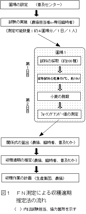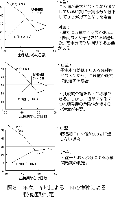 1)従来の子実水分乾減による収穫適期判定に加えて本方法を利用することにより、①品質上の収穫適期が事前に予測可能となり、②収穫体制の準備に示唆を与え、③主産地におけるフォーリングナンバー機の有効活用が図られることが期待される。