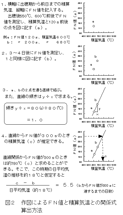 2)現場での利用場面を考慮し、FNと積算気温との関係を導き出す方法をマニュアル化した(図1、2)。すなわち、①出穂期からの積算気温が550〜600℃頃(FN100〜120s程度)に一回目のサンプリングを行い定法によりFNを計測し、②その3〜4日後に二回目のサンプリングを行い同様にFNを計測し、③その間の積算気温との関係より一次式を算出し、FN300sに対する積算気温を求め、④二回目のサンプリング時の積算気温との差をその時期の日平均気温(本試験では18℃と設定)で除算することにより到達日数を求める。