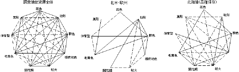 各形質の関係についてカイ2乗検定を行ったところ、供試材料全体では全ての形質間に連関が認められた。原産地別でも多くの形質間で連関が認められたが、連関する形質が地域によって異なっており、原産地によって形質の特性に偏りのあることが考えられた(図5)。