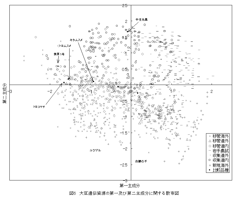 主な9形質について主成分分析により遺伝資源の分類を試みたところ、原産地及び導入先で分布の傾向が異なり、大まかな分類が可能であった(図6)。