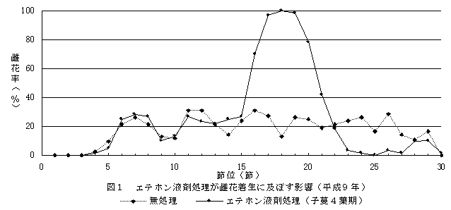 1)エテホン液剤処理により一定の節位間を安定的に雌性化することができ、処理時期としては子蔓の4葉期が適当であった。この場合の連続して雌花が着生する節位は概ね15〜20節であった(図1)。