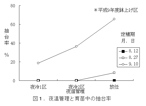 1)夜冷育苗による夏定植10,11月切り作型における定植期,夜冷温度,育苗方法の検討