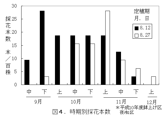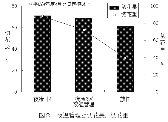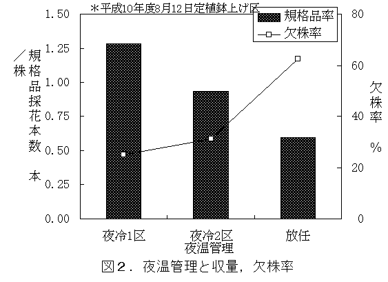 3)夜冷育苗苗利用による夏定植10,11月切り作型では鉢上げ苗を利用し8月下旬まで, 72穴トレーでは8月中旬までに定植することが必要である。