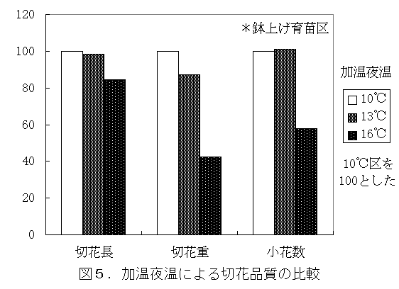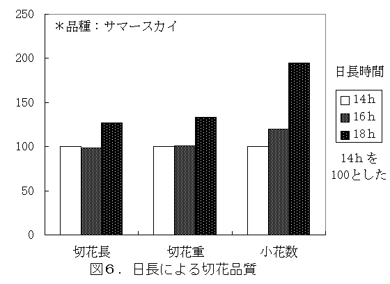 5)長日条件で開花促進,切花品質向上効果(切花長,切花重,小花数の増加)が認められた。