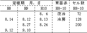 4)道南地方で夜冷育苗苗か冷房育苗苗を利用してラークスパーを無加温で10,11月に採花をするためには8月中旬までに定植することが必要である。