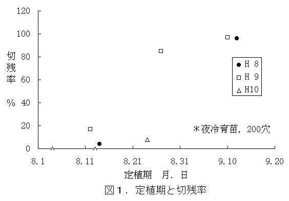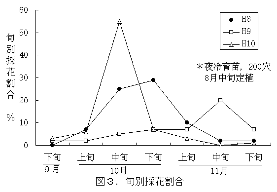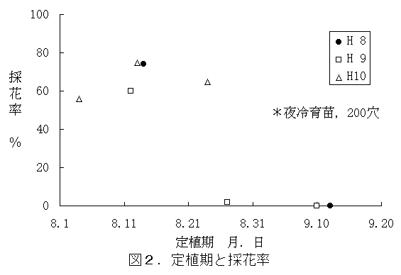 1)8月中旬定植の採花率が安定して高かった。9月上旬定植では切り残しが多く,ほとんど採花できなかった。8月下旬定植では年次により採花率が不安定であった。