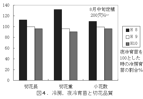 3)冷房および夜冷育苗の切花品質に与える差は年次間で変動があり,高温年では冷房育苗が優れていたが冷涼年では差は認められなかった。