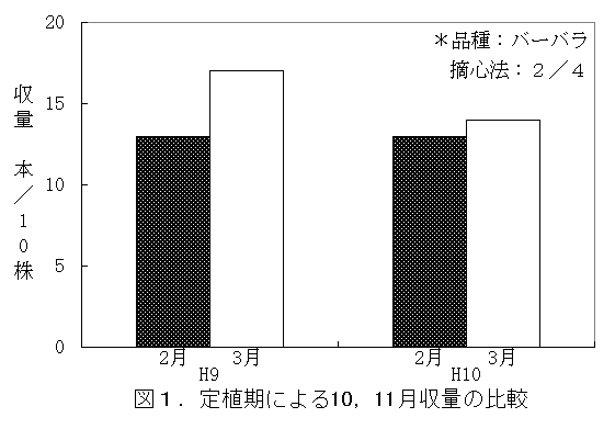 1)定植期は2月中旬と3月中旬で10,11月収量が変わらないことや,暖房費を考慮すると3月中旬が適する。
