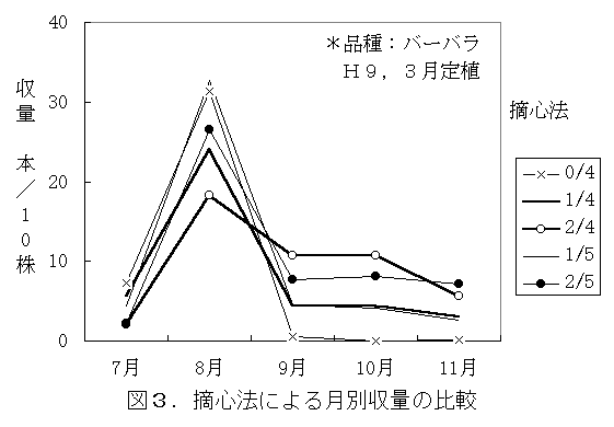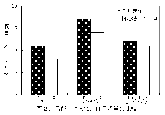2)早生品種は早期に採花終となり10,11月収量が少なく,中晩生品種では切り残しの危険性があるため中生品種が適する。