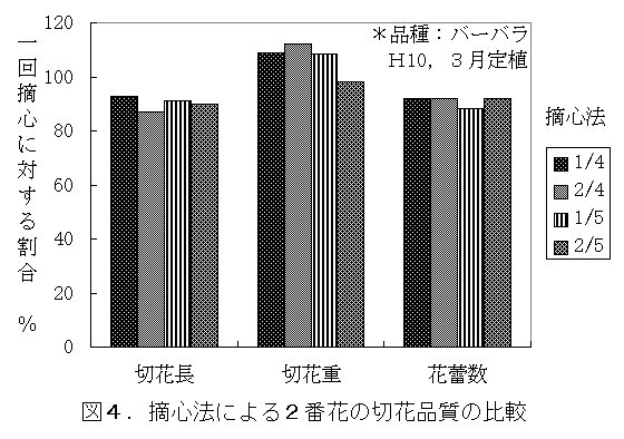 4)摘心法は採花時期の分散化や切花品質を考慮すると2/4摘心が適する。