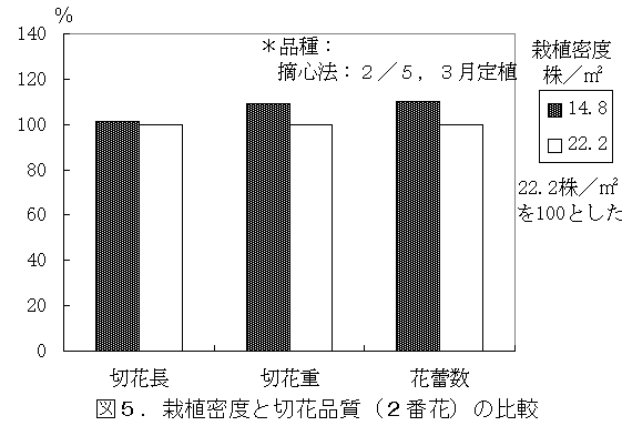 5)疎植にすることにより採花率,切花品質の向上効果が認められた。