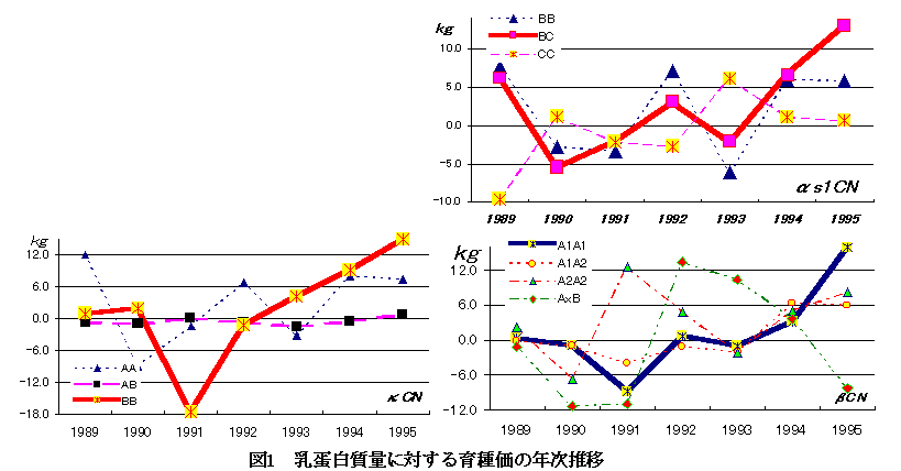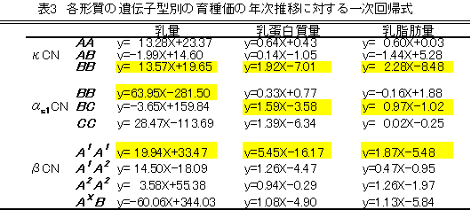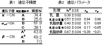 (1)βラクトグロブリンおよび3つのカゼイン遺伝子頻度は表1に示した。