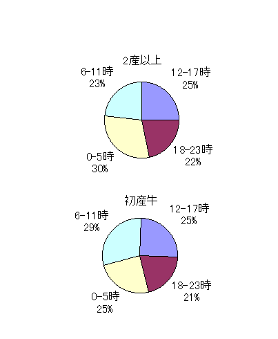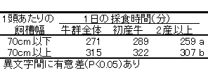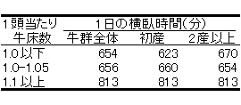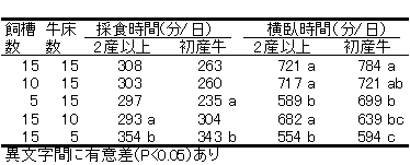 6)15頭に対して利用可能な飼槽数が5になると、2産以上の1日の採食時間は297分、初産牛の採食時間は235分となり、初産牛において飼槽数の減少による影響は大きい傾向があった。15頭に対して利用可能な牛床数が5になると、2産以上の1日の横臥時間は554分、初産牛の横臥時間は594分となったが、通路で横臥する初産牛が見られるようになった(表3)。
