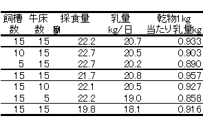 7)飼槽数および牛床数の減少により、乳量がやや低下する傾向が見られたが、乾物摂取量への影響はみられず、飼養密度と生産性の関連については今後検討が必要である(表4)。