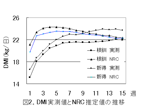 6)泌乳初期(分娩後1〜10週)におけるDMI実測値は、各場およびNRC飼養標準の推定値よりも低く、根釧では分娩後6週まで、新得では10週まで漸増したため(図2)、各推定式を用いる場合の補正係数(実測値/推定値)を示した(表3)。