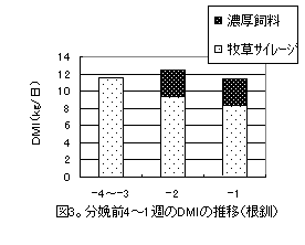 2)分娩前後におけるDMIの推移と、乳生産および生産病との関連性について検討する。