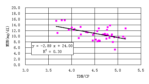 - 6頭の平均値を用いたTDN/CPに対するMUNの回帰直線は、以下の式と推定された。