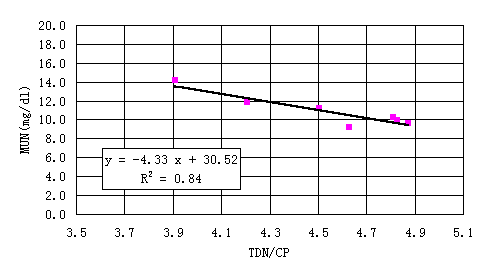 MUN(mg/dl)=-4.33×TDN/CP+30.52 (R2=0.84)