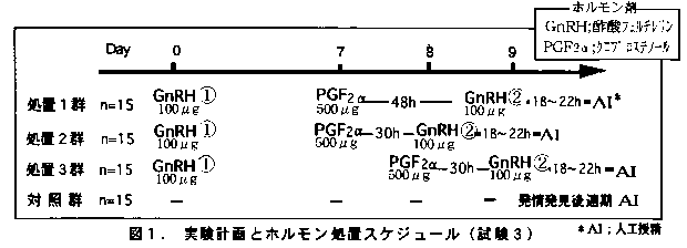 以上の結果は、分娩後4〜10週の黒毛和種雌牛に、1回目のGnRH注射後7日目にPGF2αを投与し、さらにその30〜48時間後に2回目のGnRHを投与して排卵同期化をはかり、処置終了後18〜22時間の間に授精するという定時人工授精技術を適用することによって、発情看視をすることなく従来の発情発見後の適期授精に匹敵する受胎率が得られ、かつ、空胎日数の短縮も可能であることを示している。