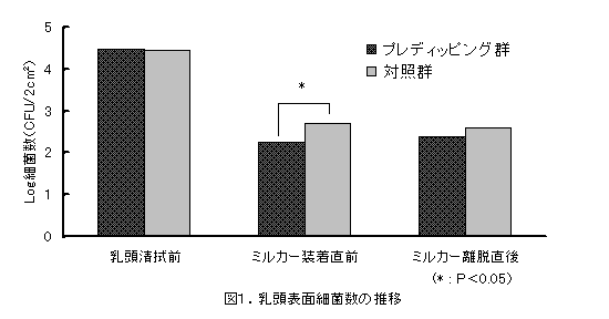 ミルカー装着直前における同細菌数は、プレディッピング群の方が対照群よりも有意(P< 0.05)に少なかった。両群ともミルカー装着直前およびミルカー離脱直後の同細菌数は、乳頭清 拭前に比較して有意(P<0.01)に低い値を示した(図1)。