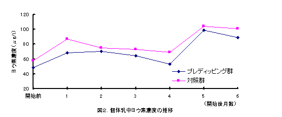3)個体乳中のヨウ素濃度はプレディッピング群と対照群の間に有意差は認められなかった。 (図2)