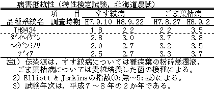 ごま葉枯病抵抗性は「ダイヘイゲン」より強く,「ヘイゲンミノリ」よりやや強い。