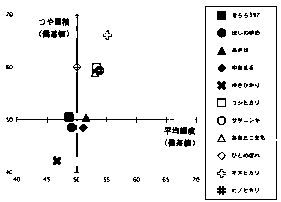 2)ゆきひかりに比較して、それ以降に育成された良食味品種は、平均輝度、つや面積とも高く、食味とともに外観品質も向上していることが明らかとなった(図3)。