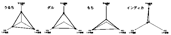 4)米飯外観の総合的評価手法として、・平均輝度、・つや面積、・つや強度を3つの要素とした、トライアングルレーダーチャートを用いたところ、さまざまな米の外観的特徴がイメージしやすい形 で表現できた(図4)。