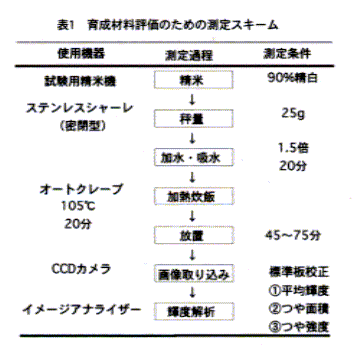 3)少量炊飯法、画像入力条件など測定条件の詳細な検討をおこない、少量の試料で安定的な測定をおこなうための測定スキームを作成した(表1)。
