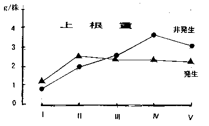 ⑤次に、深川および真狩地区における発生ほと非発生ほの比較調査(平成9年度)の結果、深川地区の 生育経過では、発生ほは地上部生育が終始優っていたが、上根量(吸収根)が、中期以降横這いとなり 増加が見られなかった。しかし、非発生ほでは、地上部の生育とともに上根量も増加し中期以降は発 生ほを上回り、根系の発達に差がみられた。(図2)