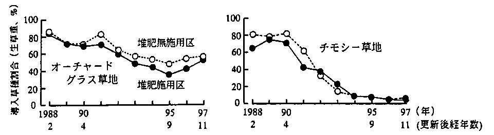 | 2)堆肥および化学肥料の処理: | 化学肥料(施肥標準量、同半量)と堆肥施用(施用、無施用)を組み合わせた4処理を設定。堆肥施用の場合は、更新時に基肥として5 t/10a、更新後6〜10年目は毎年秋に2 t/10a表面施用。 |