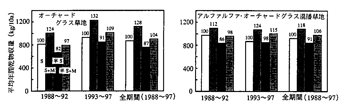 | 1)供試草地: | オ−チャ−ドグラス、ペレニアルライグラス、チモシ−、アルファルファの各単播およびアルファルファ・オ−チャ−ドグラス混播草地。1987年6月更新(褐色森林土)。チモシーは年2回、他は3回刈り。 |