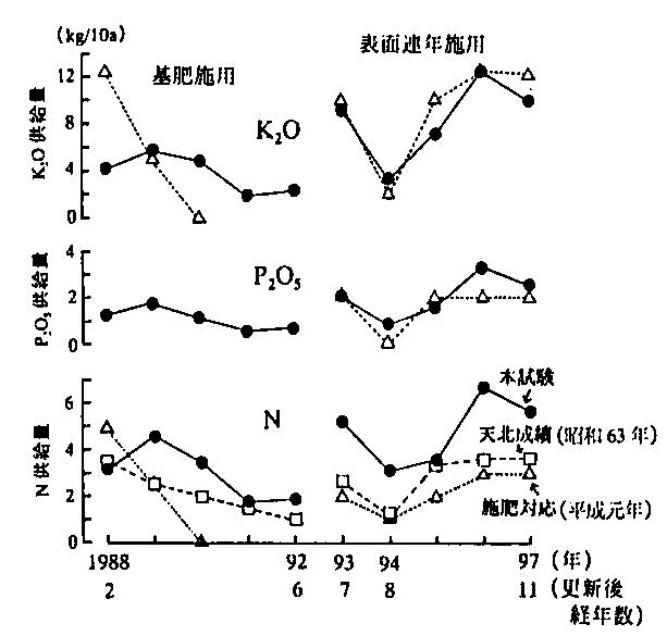 3) 基肥として施用した堆肥からの養分供給は、施用後3年目をピークに減少しながら6年間にわたり認められた。堆肥1 t当たりの年間供給量は、Nが1.0〜0.4 kg、P2O5が0.4〜0.2 kg、K2Oが1.2〜0.4 kgであった。表面連年施用した場合の供給量は、施用年次とともに増大する傾向を示した。同供給量は、Nが1.5〜3.5 kg、P2O5が0.5〜1.5 kg、K2Oが1.5〜6.0 kgであった。これらは既往の成績の値とおおよそ合致していた(図3)。<土壌理化学性に対する効果>