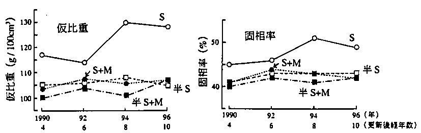 S区:化学肥料を施肥標準量(1987年当時)施与、S+M区:化学肥料を施肥標準量施与し、堆肥を更新時に