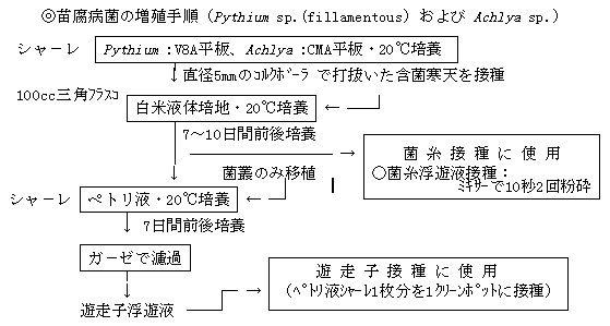 | ① | Pythium (fillamentous)の増殖は平板はV8A、液体培地は白米培地、培養温度は平板、液体培地ともに20℃が適当であった。 |