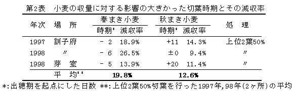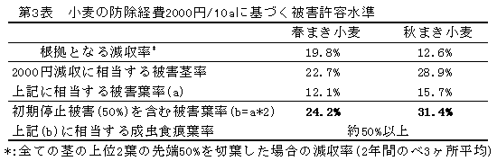 | 2) | 減収額=防除経費2000円/10aとなるような被害量は,上位2葉の50%被害を受けた茎の割合(被害茎率)で示すと,春まき小麦 : 22.7%,秋まき小麦 : 28.9%となる(第3表)。 |