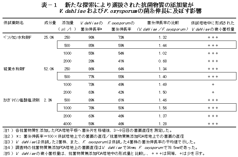 | (3) | 32種の薬剤を検討した結果、カスガマイシン塩酸塩液剤(1000μl/l),硫黄水和剤F(500μl/l),ペンシクロン水和剤F(500μl/l)をそれぞれPDA培地に添加することにより、F. oxysporumの菌糸伸長がV. dahliaeよりもより強く阻害され、V. dahliaeの検出培地の改良に利用できると考えられた(表−1)。 |